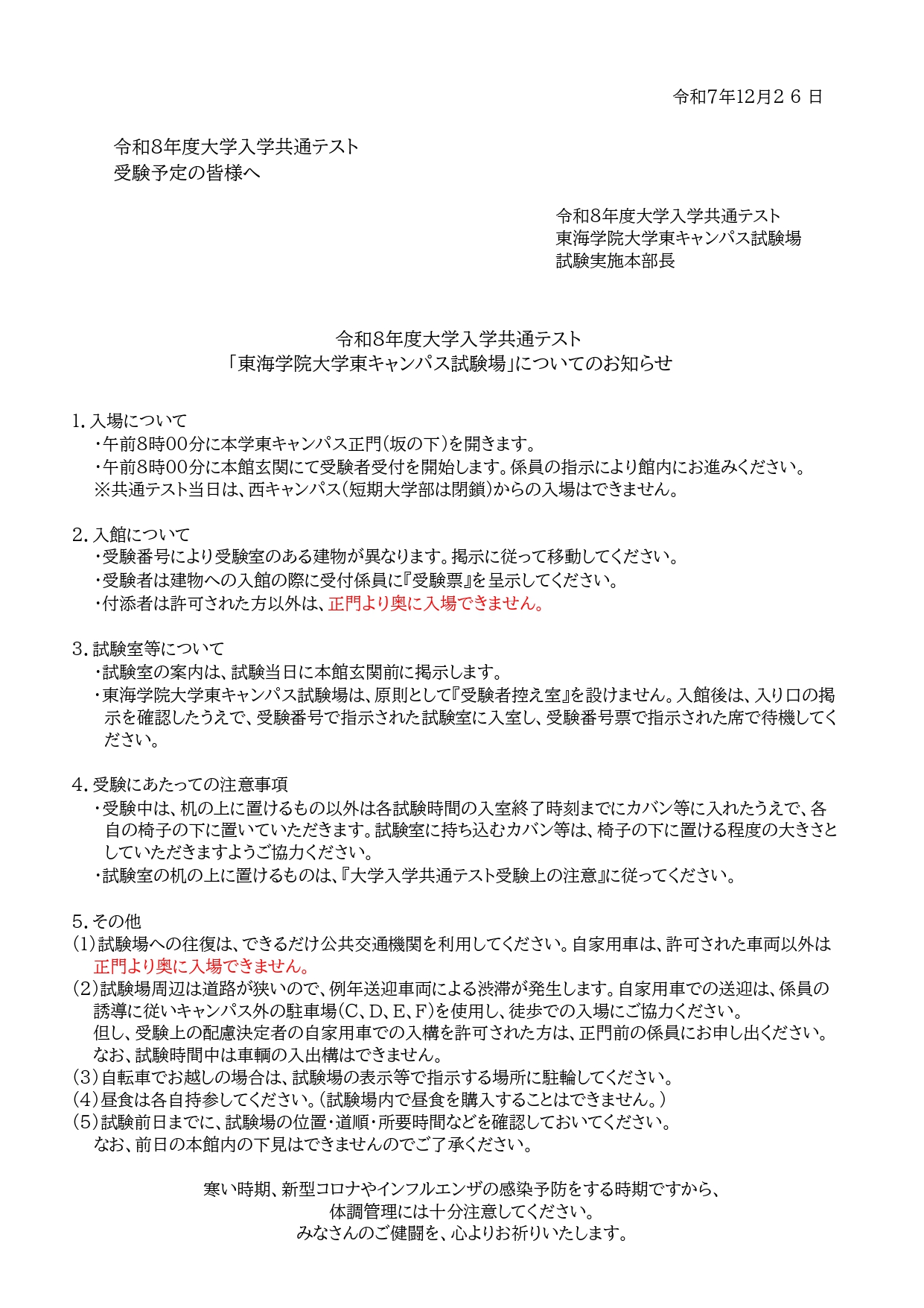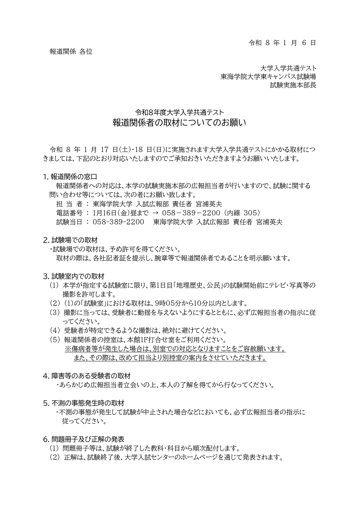 ホーム › 重要なお知らせ › 令和8年度大学入学共通テスト 東海学院大学東キャンパス試験場について (東海学院大学東キャンパス試験場 試験実施本部長) 重要なお知らせ 令和8年度大学入学共通テスト 東海学院大学東キャンパス試験場について (東海学院大学東キャンパス試験場 試験実施本部長) 2026年01月09日 (1)出願された方々・受験予定の皆様 「東海学院大学東キャンパス試験場」についてのお知らせ (2)報道関係 各位 報道関係者の取材についてのお願い < 新着情報 新着情報 お知らせ 在学生 地域・社会 重要なお知らせ 研究活動 教員紹介 研究活動にかかる規程類 科学研究費助成事業研究倫理 トピックス 研究報告 産学官連携 公開講座 通報窓口 イベント オープンキャンパス 公開講座 その他イベント