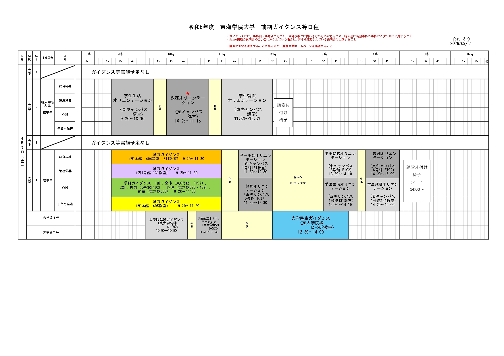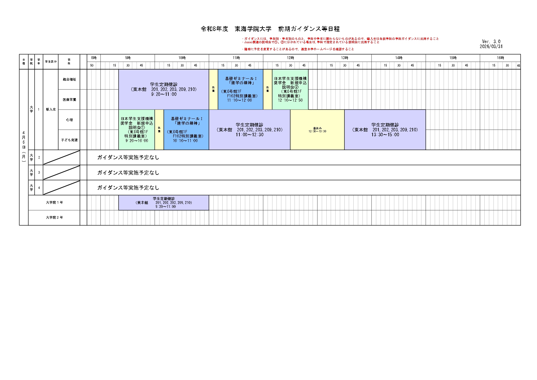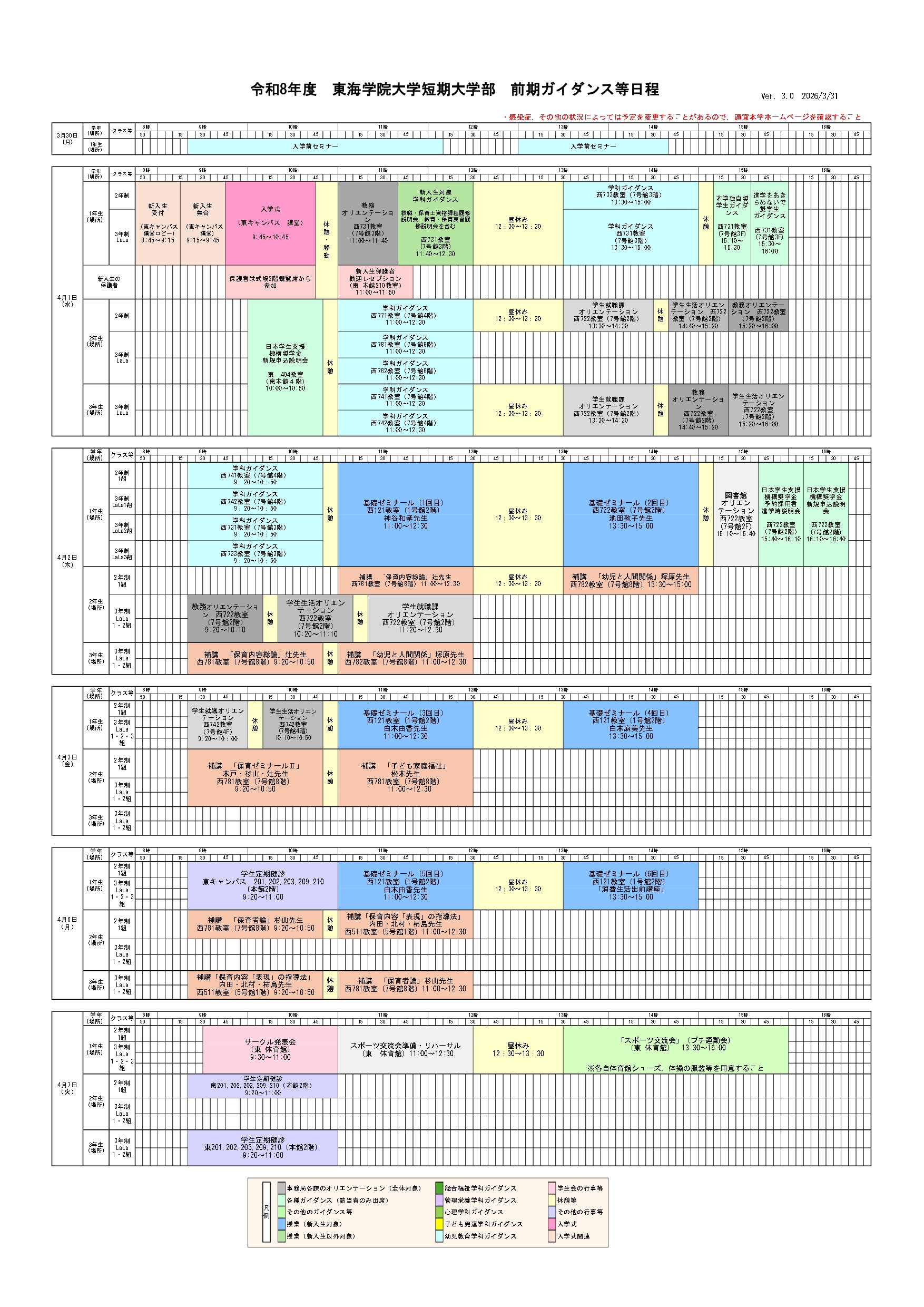 ホーム › 重要なお知らせ › 令和8年度学事日程、前期ガイダンス等日程について 重要なお知らせ 令和8年度学事日程、前期ガイダンス等日程について 2026年03月13日 ↓下記のPDF版はこちら〈令和8年度前期ガイダンス等(大学)〉 ↓下記のPDF版はこちら〈令和8年度前期ガイダンス等(短大)〉 < > 新着情報 新着情報 お知らせ 在学生 地域・社会 重要なお知らせ 研究活動 教員紹介 研究活動にかかる規程類 科学研究費助成事業研究倫理 トピックス 研究報告 産学官連携 公開講座 通報窓口 イベント オープンキャンパス 公開講座 その他イベント