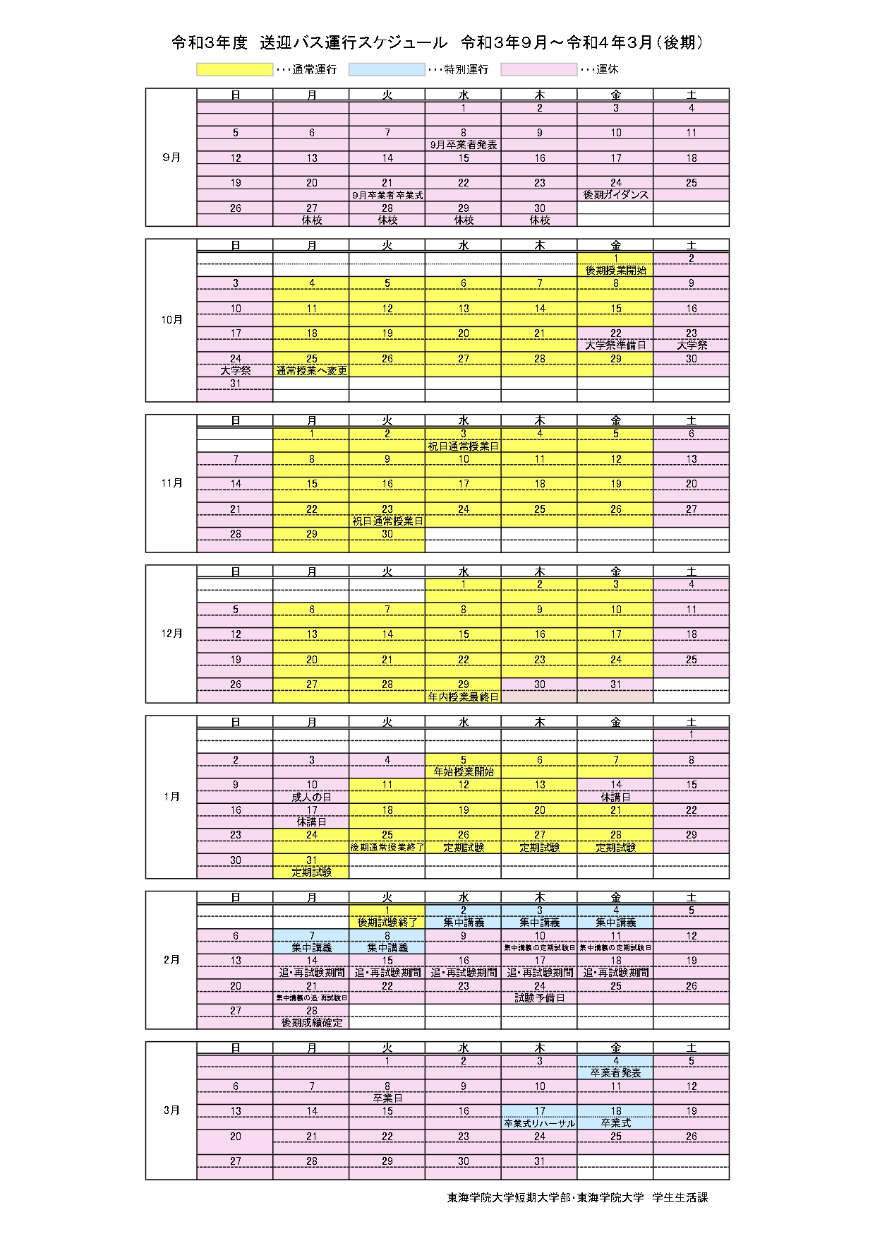 ホーム › 新着情報 › お知らせ › 令和3年度送迎バスについて(2021.10.12更新) お知らせ 令和3年度送迎バスについて(2021.10.12更新) 2021年10月12日 2021年度授業期間送迎バス運行スケジュール 2021年度送迎バス等時刻表(通常ダイヤ)後期 < > 新着情報 新着情報 お知らせ 在学生 地域・社会 重要なお知らせ 研究活動 教員紹介 研究活動にかかる規程類 科学研究費助成事業研究倫理 トピックス 研究報告 産学官連携 公開講座 通報窓口 イベント オープンキャンパス 公開講座 その他イベント