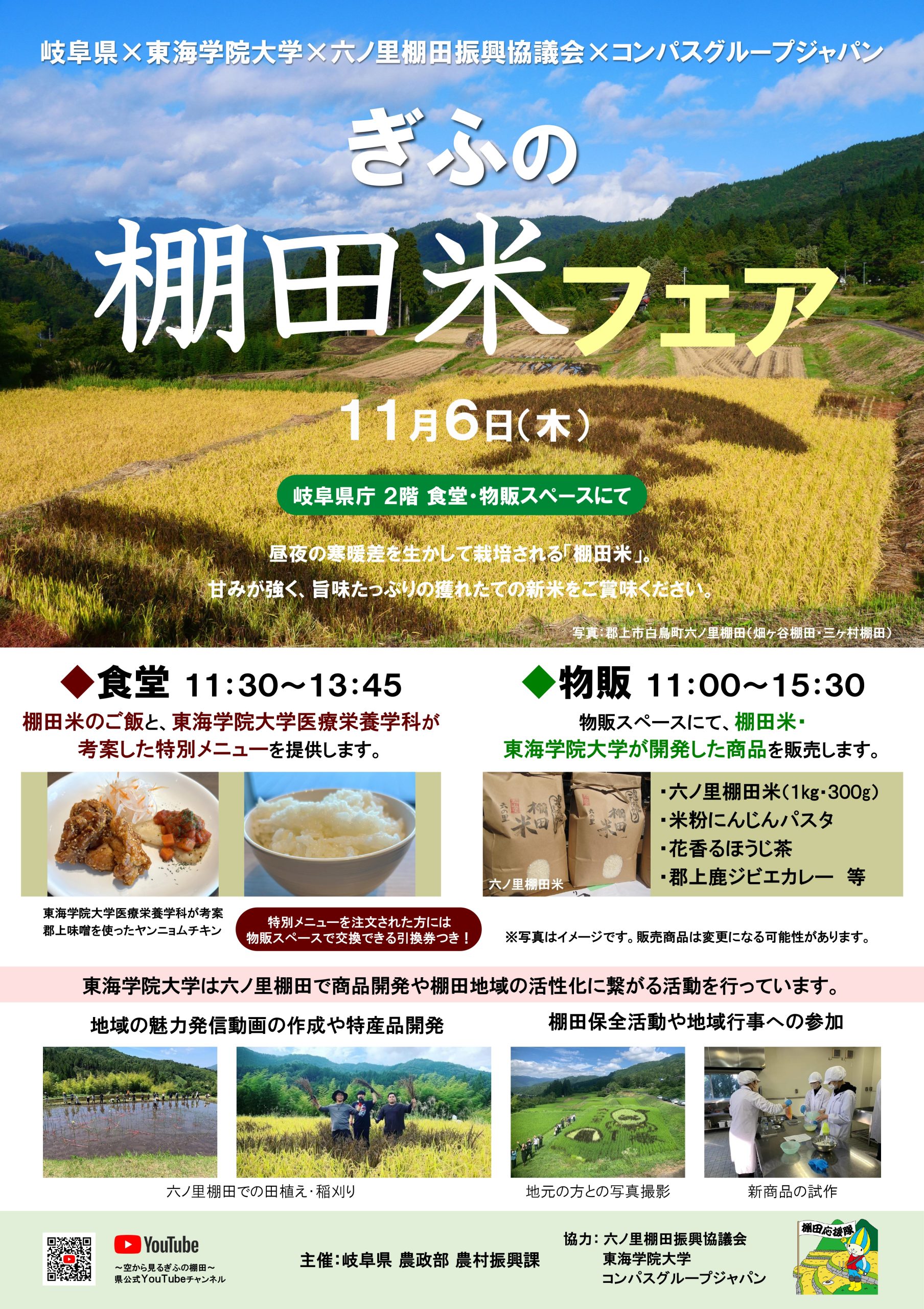 11月6日(木)岐阜県庁にて「ぎふの棚田米フェア」が開催されます。医療栄養学科の学生考案の特別定食も県庁の食堂メニューに登場し、11時~15時30分まで2階食堂横にて医療栄養学科の学生のオリジナル棚田米商品、六ノ里棚田米などを販売し、棚田米のPRを行います。是非お越しください。