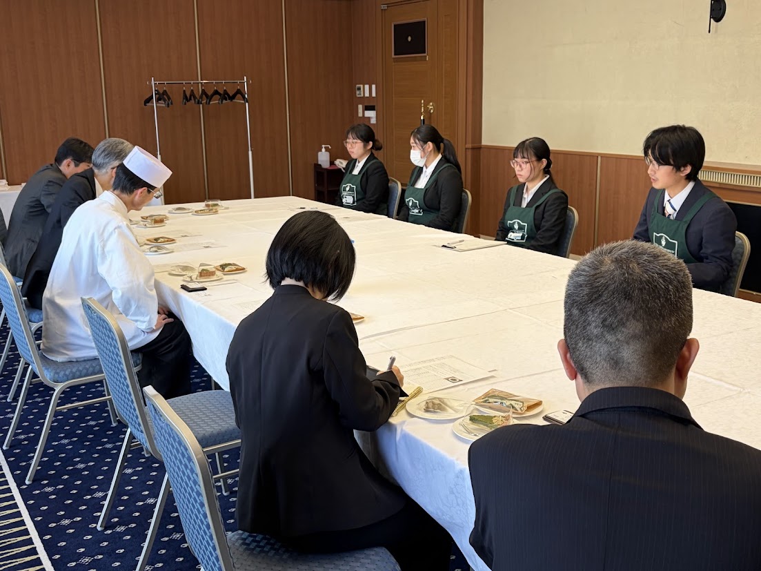 医療栄養学科の学生がJA全農岐阜の依頼を受け、「いび抹茶」の商品化に取り組んでいます。提案した「いび抹茶」の健康的な商品を岐阜グランドホテルの総料理長様へご試食いただきました。「いび抹茶」の新商品の完成を目指し、今後も改良を続けていきます。