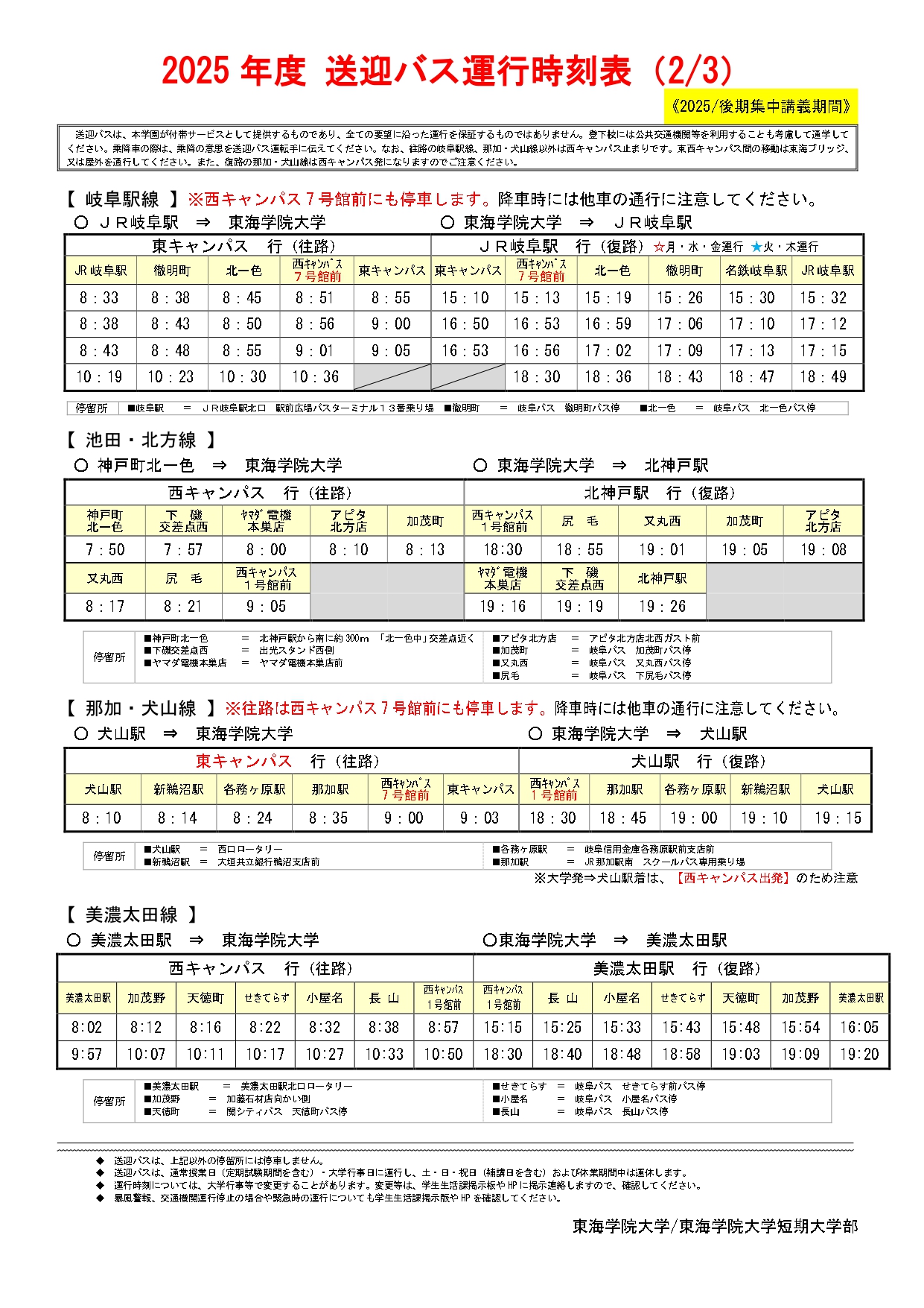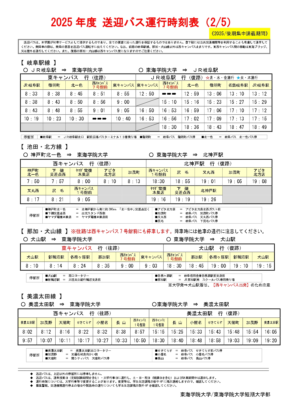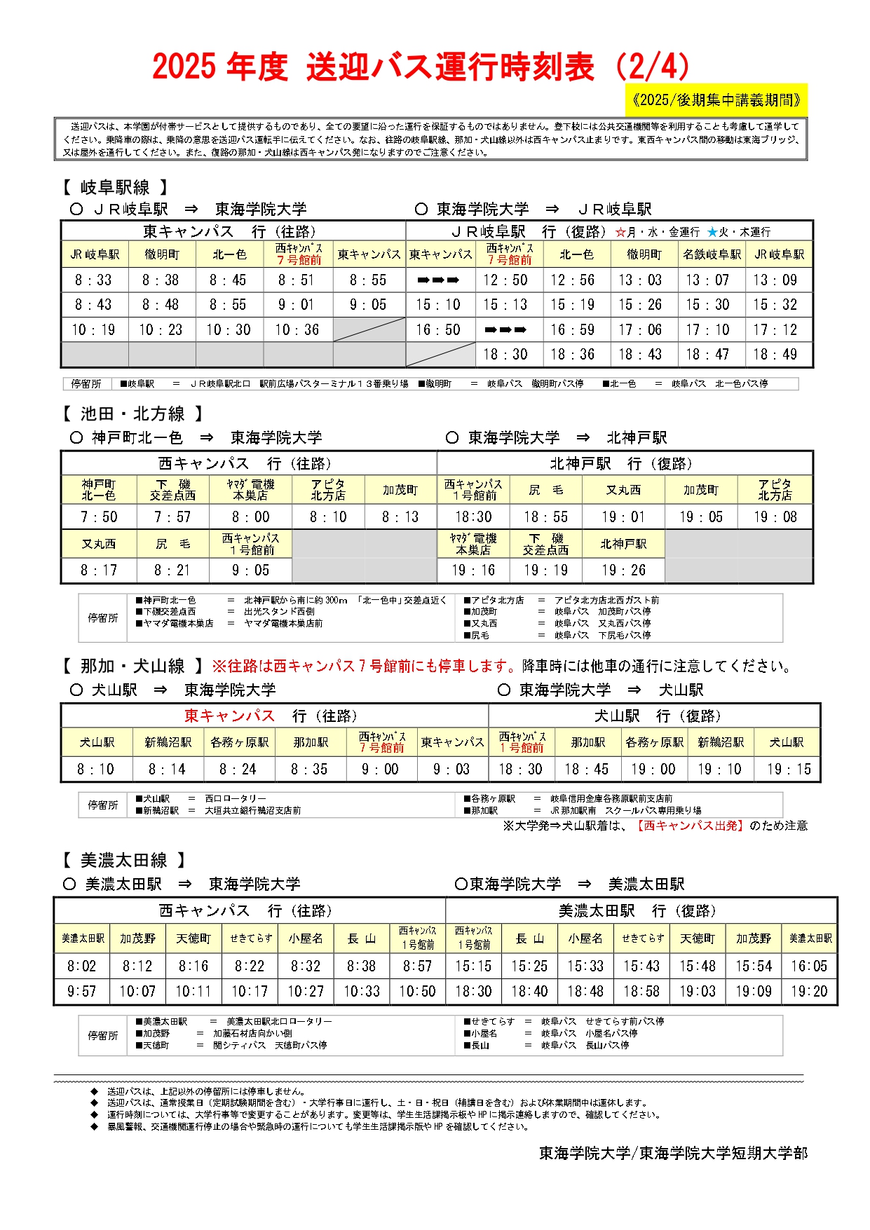 ホーム › 新着情報 › お知らせ › 2025年度後期 集中講義送迎バス時刻表について お知らせ 2025年度後期 集中講義送迎バス時刻表について 2026年01月26日 2/2(月)~2/6(金)の前期集中講義期間中は、日によって運行時間が異なります。時刻表をよく確認し、乗り遅れることがないようご注意ください。 ◆PDF版はこちらから↓ ★2025 送迎バス等時刻表(集中講義)2月2日 ★2025 送迎バス等時刻表(集中講義)2月3日 ★2025 送迎バス等時刻表(集中講義)2月4日 ★2025 送迎バス等時刻表(集中講義)2月5日 ★2025 送迎バス等時刻表(集中講義)2月6日 ※iPhoneやandroid等の端末で画像が上手く反映されない場合は、画面を横にしてご覧ください。 < 新着情報 新着情報 お知らせ 在学生 地域・社会 重要なお知らせ 研究活動 教員紹介 研究活動にかかる規程類 科学研究費助成事業研究倫理 トピックス 研究報告 産学官連携 公開講座 通報窓口 イベント オープンキャンパス 公開講座 その他イベント