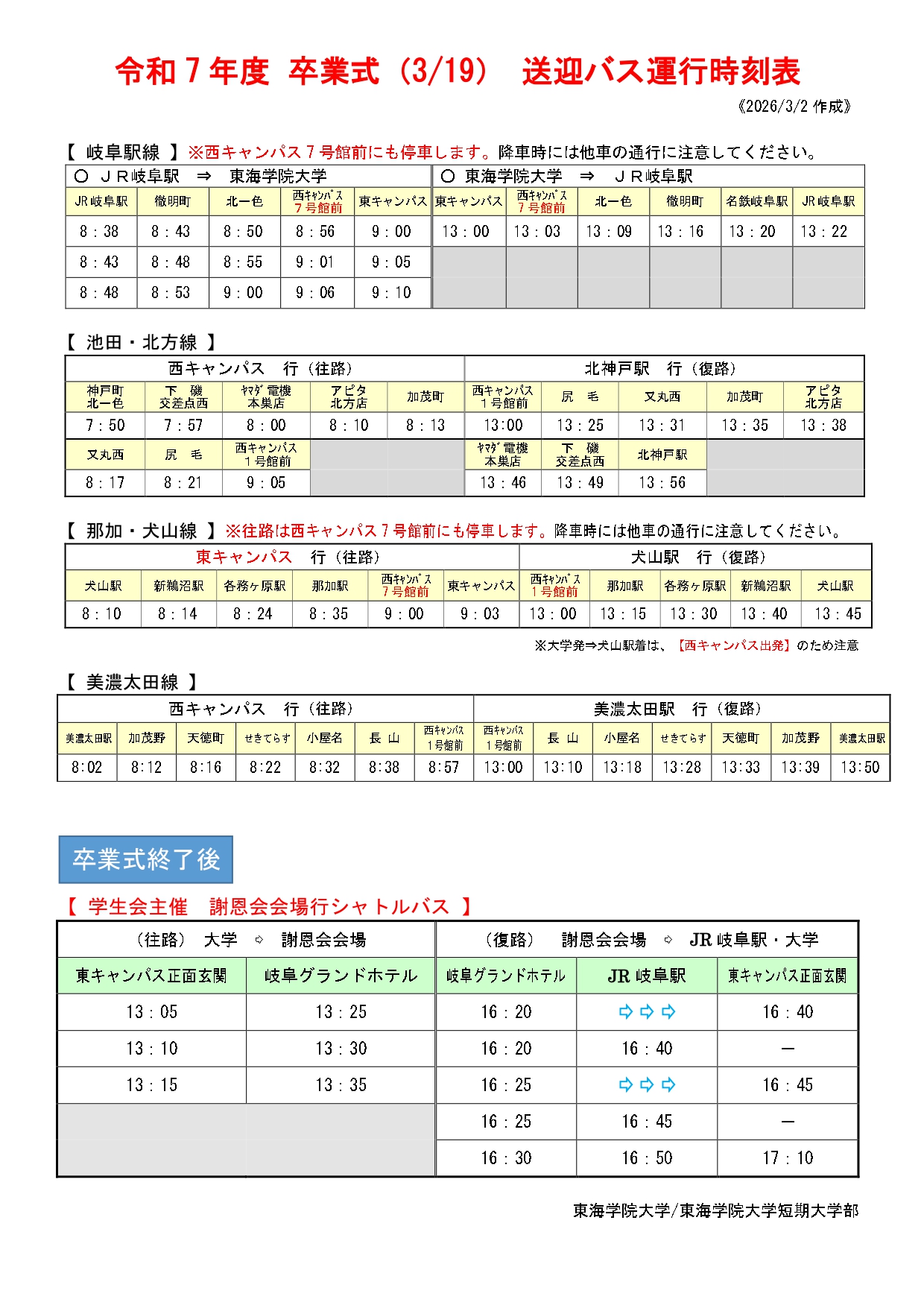 卒業式後に謝恩会が開催されますので、会場まで送迎バスを利用する学生の方も時刻表をよく確認していただき、乗り間違いや乗り遅れがないようご注意ください。