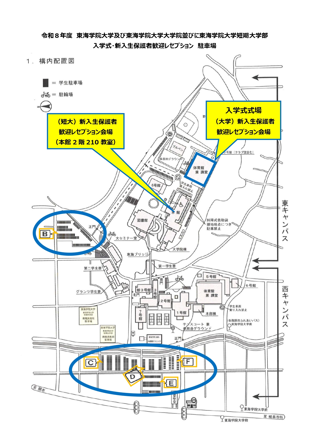 お車でお越しの際は、学生駐車場B~Fをご利用ください。なお、駐車場に限りがございますので、できるだけ公共交通機関をご利用ください。