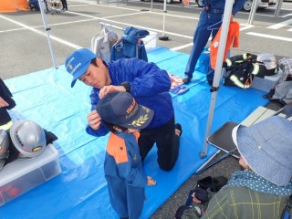 本学の学生達は、そのイベントに来られた地域住民の方々に対して「消防車両の見学」・「濃煙体験」・防火服着装などの誘導説明並びにきぐるみを着装しての「住宅用火災警報器普及PR活動」等に従事しました。
